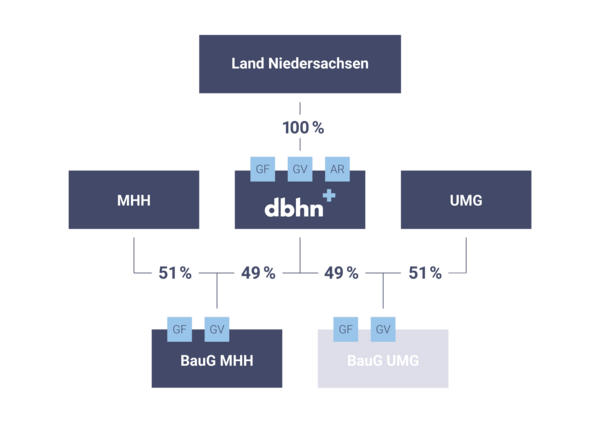 Zum Zwecke der operativen Umsetzung der durchzuführenden Maßnahmen gründen DBHN und MHH im Rahmen der zentralen Steuerung eine Baugesellschaft in der Rechtsform einer GmbH, an der die MHH als Mehrheitsgesellschafter (51 Prozent) und die DBHN als Minderheitsgesellschafter (49 Prozent) beteiligt sein werden, Die Zuständigkeiten zwischen der Dachgesellschaft und der Baugesellschaft, dem Land Niedersachsen und der Hochschulmedizin sind klar voneinander abgegrenzt, um Doppelstrukturen zu vermeiden.